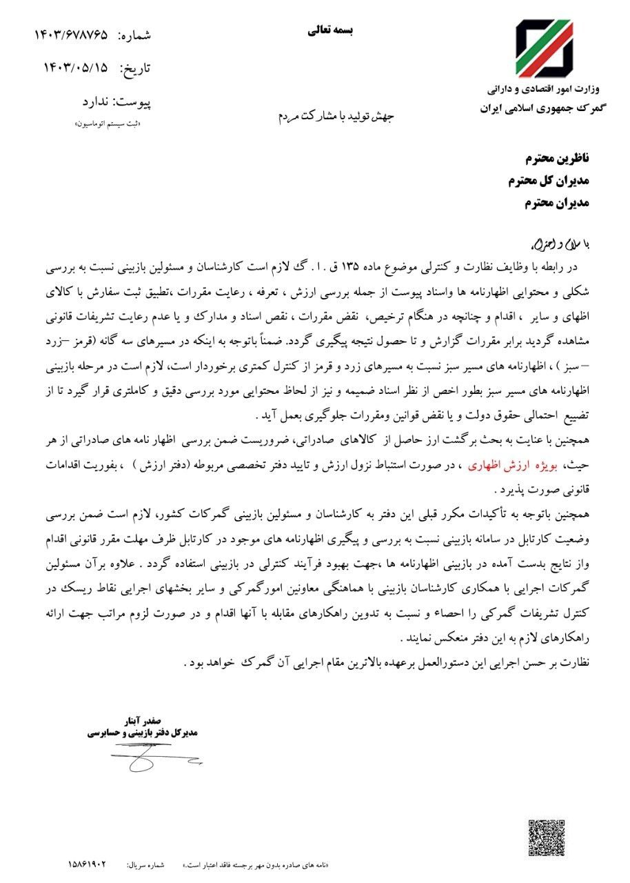 تأکید بر وظایف نظارت و کنترلی بازبینی و بررسی شکلی و محتوایی اظهارنامه ها و اسناد پیوست از لحاظ بررسی ارزش ، تعرفه ، مقرارت ، ثبت سفارش و... با توجه به مسیرهای سه گانه