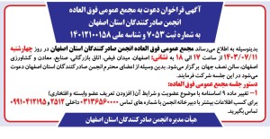 برگزاری مجمع عمومی به طور فوق العاده انجمن صادرکنندگان استان اصفهان مورخ ۱۴۰۳/۰۷/۱۱ ۱- انتخاب آقای محمد امینی به عنوان رییس هییت مدیره ۲- انتخاب آقای نوید وفایی به عنوان نائب رئیس...