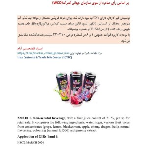 بر اساس رأی سازمان جهانی گمرک (WCO) نوشیدنی غیر گاز دار داری ۲۱ درصد آب میوه ارائه شده برای خرده فروشی متشکل از آب و شکر و آب میوههای مختلف ذیل ردیف تعرفه 220210 طبقه بندی می شود